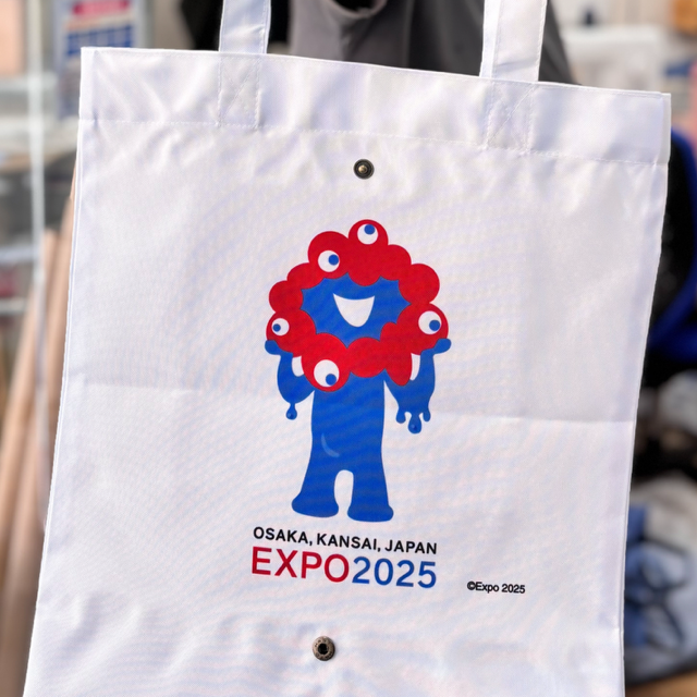 2025年に大阪で開催された大阪万博のマスコットキャラクターがプリントされたトートバッグ。