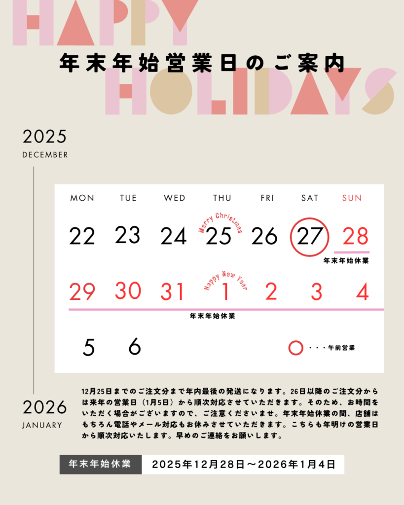 2025年12月22日 In BLOG, NEWS, NEWS&BLOG By hitsujigumosun 年末年始の営業のお知らせ こんにちは。Hitsujigumo・Sunです。(ひつじぐも・サン) 気付けば、今年も残りわずか。正直、時の流れが速すぎて怖いぐらいです。あっという間に年を越えてしまいそうなので、年末年始の営業のお知らせをサクッと皆様にお伝えしたいと思います。 おやすみは↑の通りになります。27日の午後から1月4日まで年末年始休業を取らせていただきます。 この間のご注文や、ご連絡等は年明け5日から順次対応させていただきますので、早めのご連絡をお願いいたします。 皆様今年1年ありがとうございました。今年は、Hitsujigumo・Sun10周年記念を迎えました。皆様とのご縁や応援のおかげです。来年も今まで以上に邁進していきたいと思っています。今後も皆様からの応援よろしくお願いいたします。 Tags: お知らせ hitsujigumosun